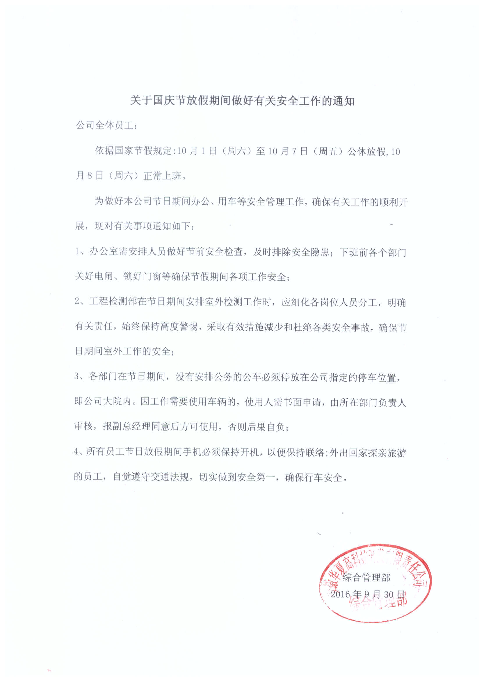 關(guān)于國慶節(jié)放假期間做好有關(guān)安全告知的通知